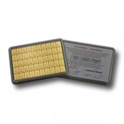 A tábla 50x1 gramm aranylapocskából áll össze,melyek egy perforálás mentén letörhetõk anélkül, hogy elveszítené a minõségét és értékét. Optimális feloszthatósága következtében a leglikvidebb termék a piacon. A megjelenített kép csupán illusztráció.